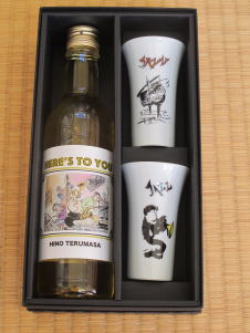左の作品は、長崎県五島の五島ワイナリーのワインに、日野皓正画のワイングラスをつけたもの。ワインのラベルも日野皓正作。セット5000円(税込み)。大川内山の伊万里陶苑本社で扱っていますが、当ギャラリーからも取り寄せいたします。 |