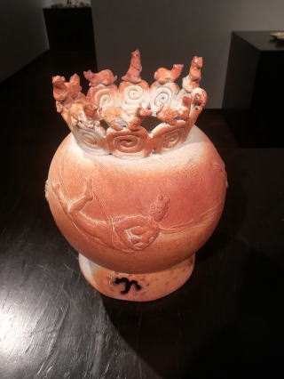 ―最近はどのような作品を。 藤ノ木 私は昔から食器と茶道具とあとはオブジェの3拍子でやっていますが、最近特にレリーフが面白くて、集中的に作るようになりました。 ―これは削るのですか。 藤ノ木 盛ります。 ―以前から唐津にあるのですか。 藤ノ木 唐津にはないです。新しいことをどんどん挑戦しないと。 ―きっかけは。 藤ノ木 お客さんに太陽の文様を作ってくれと言われまして。今回出したのは出雲にある太陽紋とネズミ。天女のレリーフ。下にあるのは、不老不死の霊芝です。 ―窯焚きは以前と同じですか。 藤ノ木 変わらず、登り窯が年に5回、穴窯が年に1回というスタンスです。 ―息子さん(藤ノ木陽太郎)が自立されたのですね。 藤ノ木 最近は自活するようになりました。窯は一緒ですが、展示は別にしています。 ―黒田陶苑の個展も別。 藤ノ木 息子と1年おきに開いています。 ―作風は。 藤ノ木 一緒にやっていると似てくるので、作家である以上違うものを作るようにきつく言っています。 ―最近の唐津焼の世界はどうですか。 藤ノ木 若手が出てきたのですが、こういう時代になって、お互いに競い合い、食い合ってしまうというか。そういう状態が若干出てきている。ゆゆしき問題です。 -お年は。 藤ノ木 70歳になったばかりです。 |