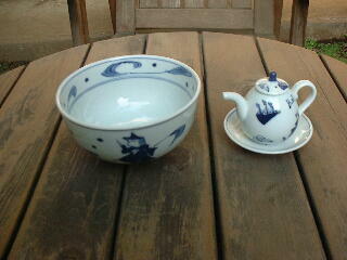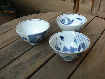 また、素焼きの上に赤、黄、緑などで 絵付け(上絵付け)したものが色絵(有田では赤絵と呼ぶ)ですが、色絵が出現してからも染付けは、製造の容易さ、そのシンプルな美しさもあり、主に日常食器として製造が続けられてきました。骨董店などでよくみかける「古伊万里」の食器類も、染付けが多いようです。